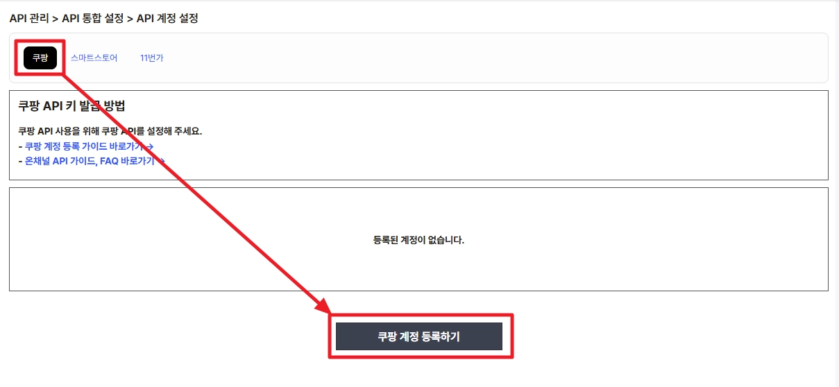 (3) [쿠팡 > 쿠팡 계정 등록하기] 버튼을 눌러요.