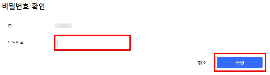 쿠팡 WING 판매자 센터 계정의 비밀번호 입력 후 [확인] 버튼을 눌러요.