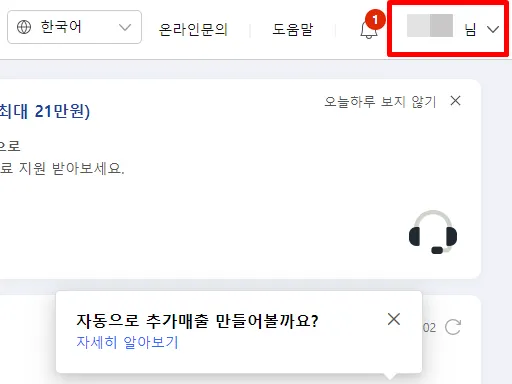 로그인 후 우측 상단 [(담당자 이름) 님 ∨] 버튼을 눌러요.