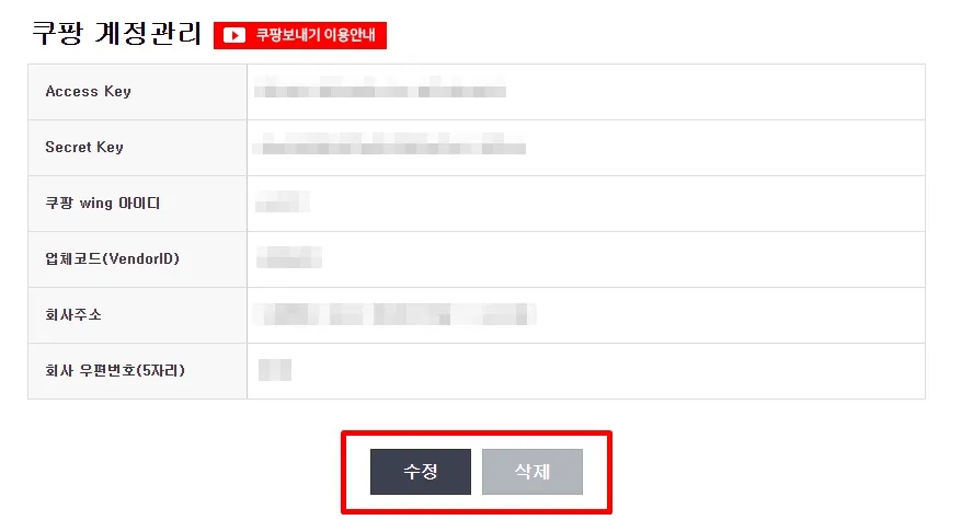 쿠팡 API 계정 발급 시 확인했던 ‘Access Key’, ‘Secret Key’, ‘업체코드’를 복사하여 기재해요.