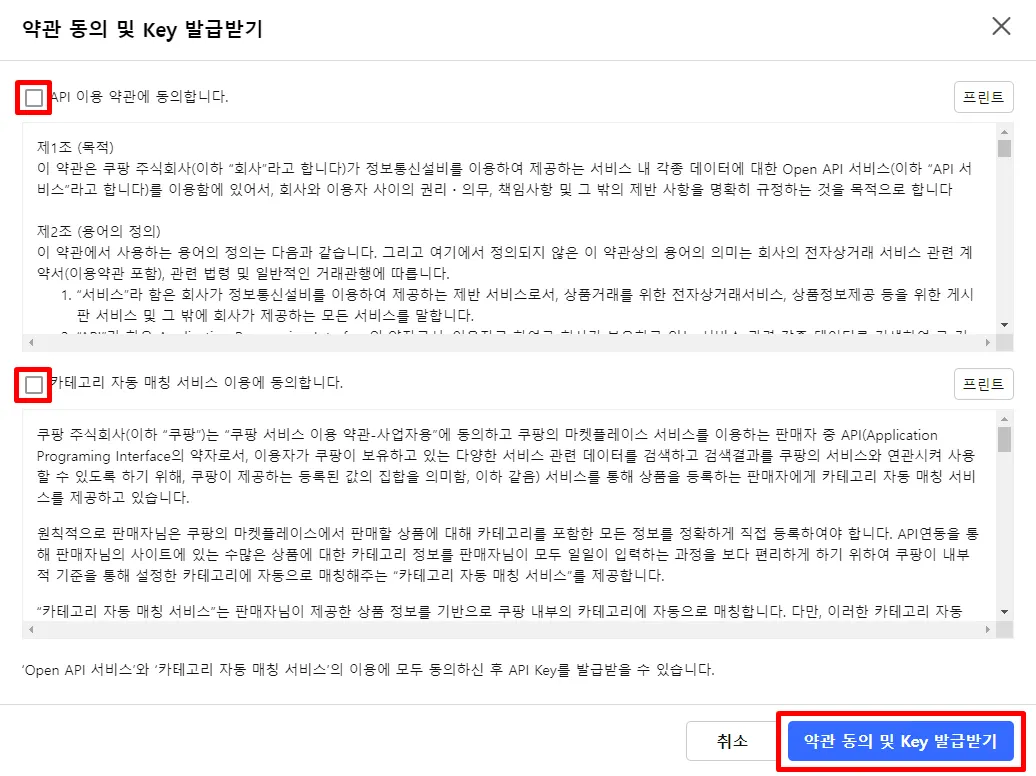 약관 동의 창이 뜨면 각 동의 내용 체크박스에 체크 후 하단의 [약관 동의 후 Key 발급받기] 버튼을 눌러요.