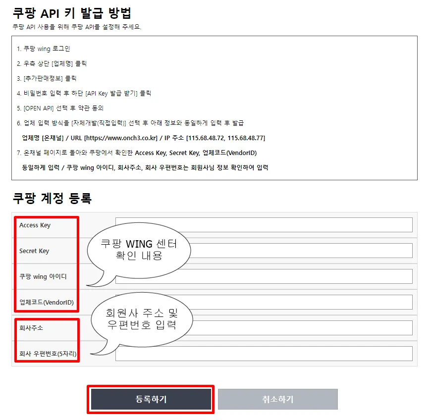 쿠팡 WING 아이디는 API 계정을 발급받으신 쿠팡 WING 아이디를 입력하고, 회사 주소 및 우편번호는 판매사님의 정보를 입력한 뒤 [등록하기] 버튼을 눌러요.