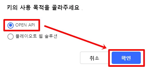하단과 같은 창이 뜨면 [OPEN API]로 선택한 뒤, [확인] 버튼을 눌러요.