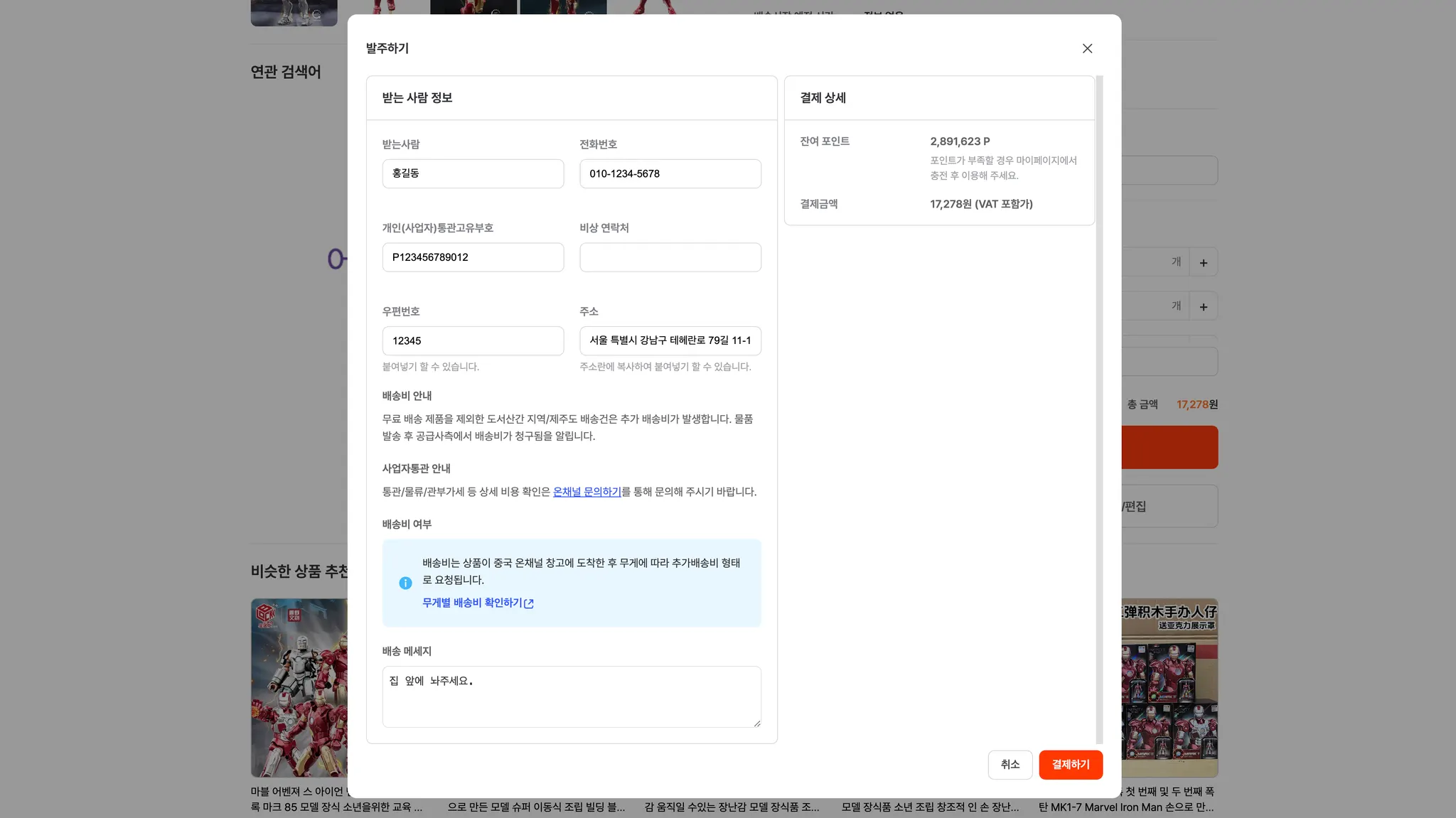 받는 사람의 정보를 입력하고 [결제하기] 버튼을 눌러 발주를 완료해 주세요.