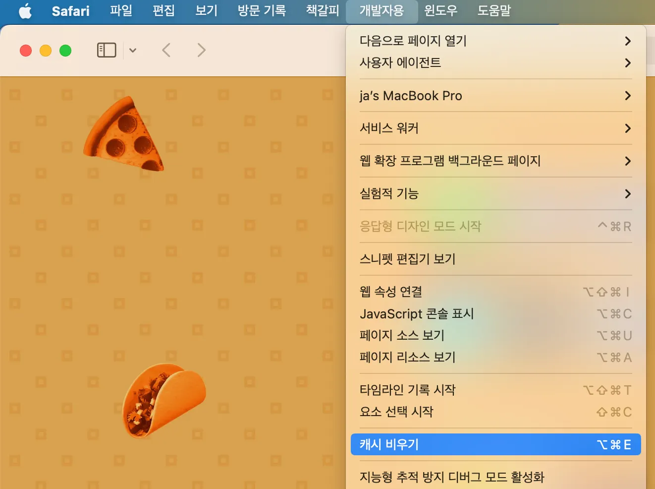 맥의 메뉴 막대에서 [개발자용] 메뉴를 클릭한 후 [캐시 비우기]를 클릭하여 캐시를 삭제합니다.