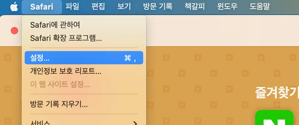 맥의 상단 메뉴 막대에서 [Safari]를 클릭하여 [설정] 메뉴에 접근