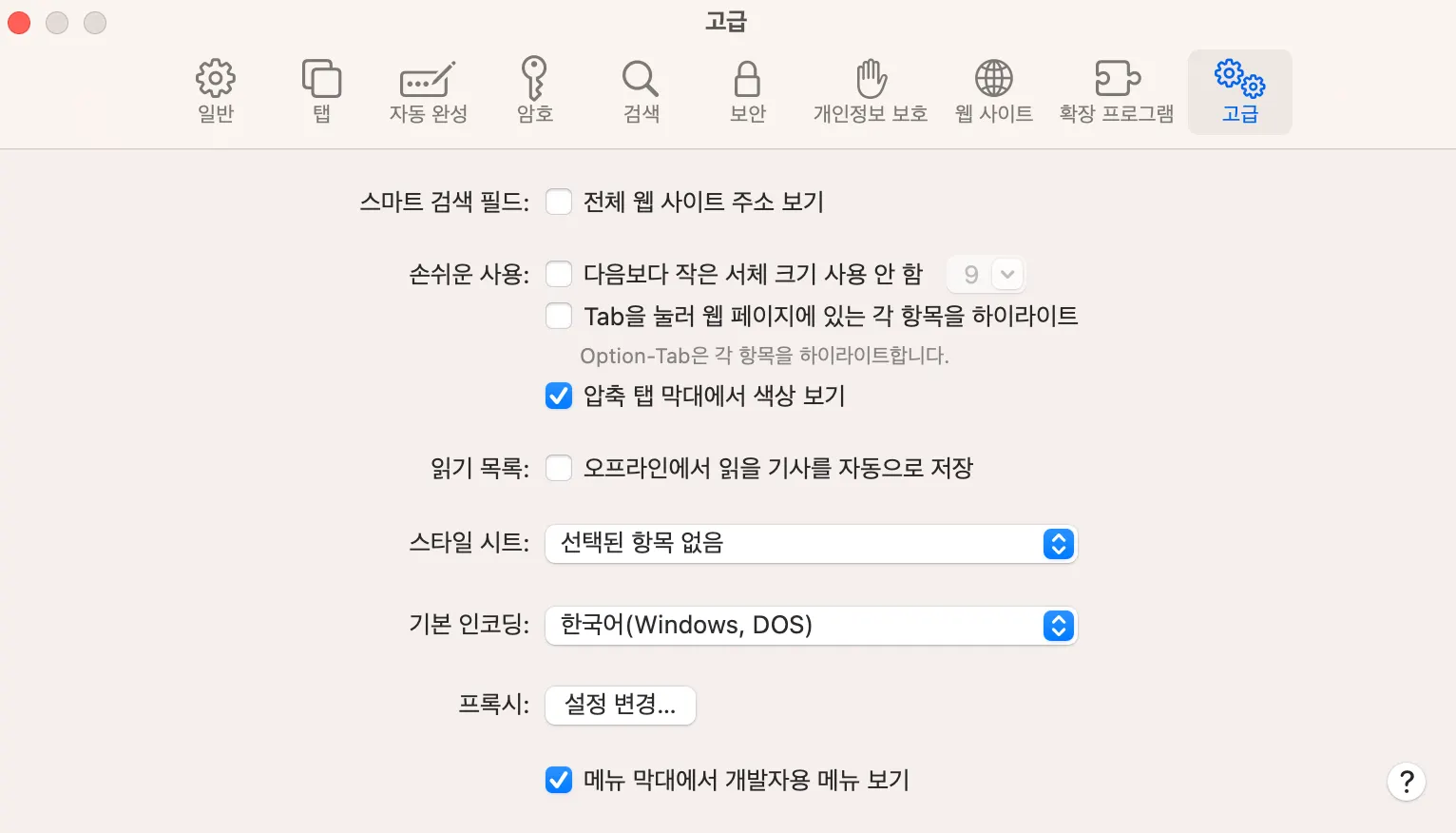[고급] 메뉴에서 ‘메뉴 막대에서 개발자용 메뉴 보기’ 설정이 아래의 이미지처럼 켜있는지 확인
