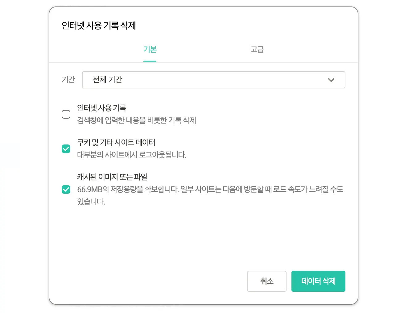 기간을 ‘전체 기간’으로 설정하여 [데이터 삭제] 클릭
