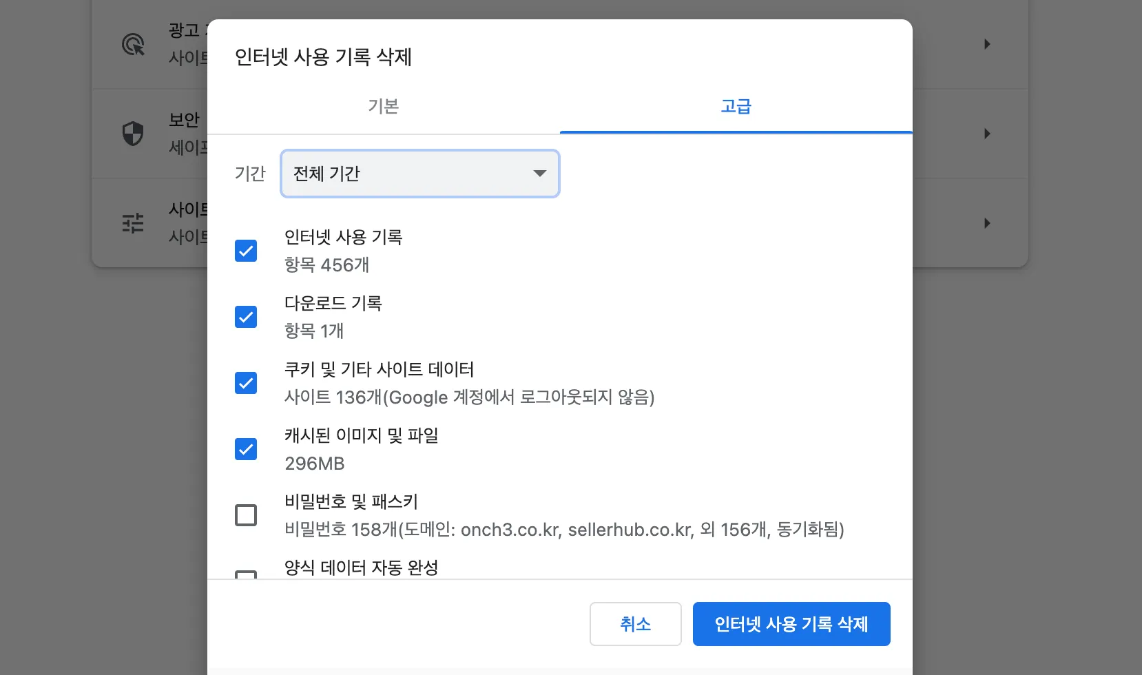 검색 데이터 지우기 > 지금 검색 데이터 지우기에서 지울 항목 선택을 선택합니다.