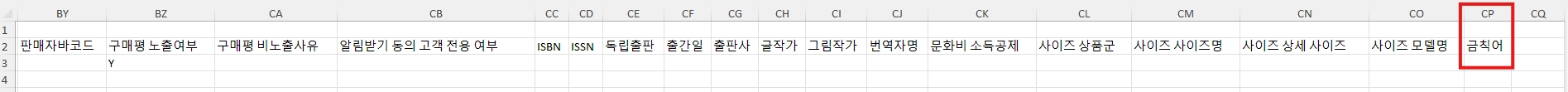 엑셀 폼 다운로드 시 마지막 열에는 “금칙어”항목이 추가됩니다. 사이트에 상품 엑셀 등록 시에는 금칙어 열을 삭제하고 등록 바랍니다.