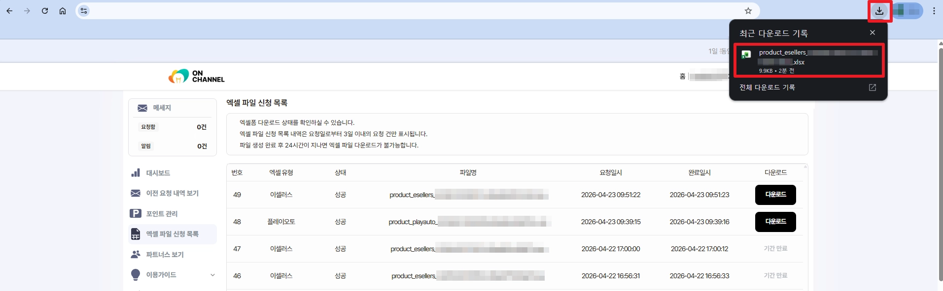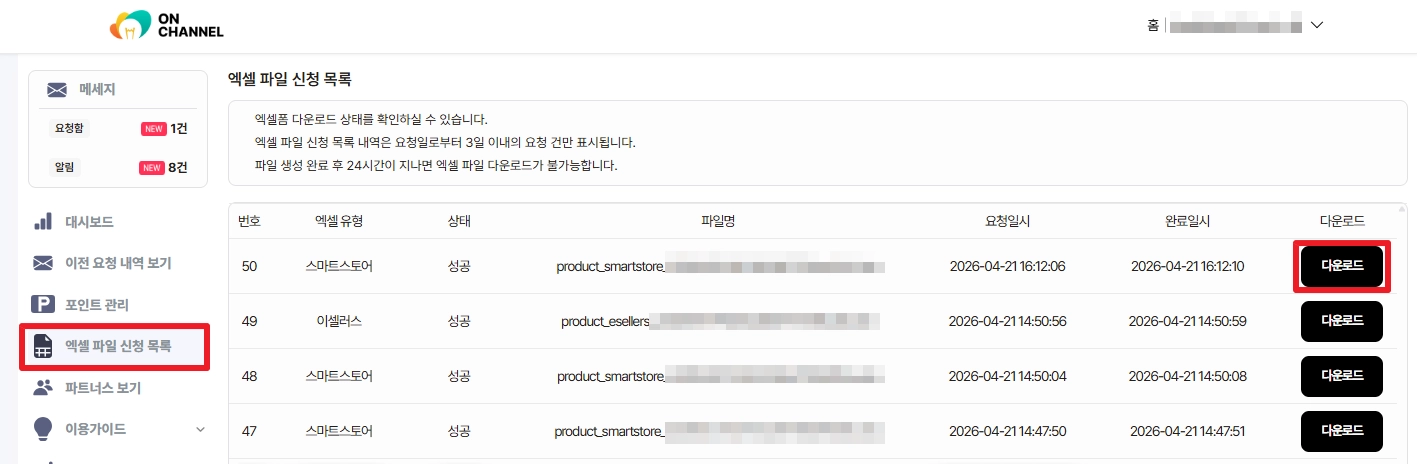 엑셀 파일 다운로드는 파일 생성 완료 후 24시간 이내만 가능합니다.