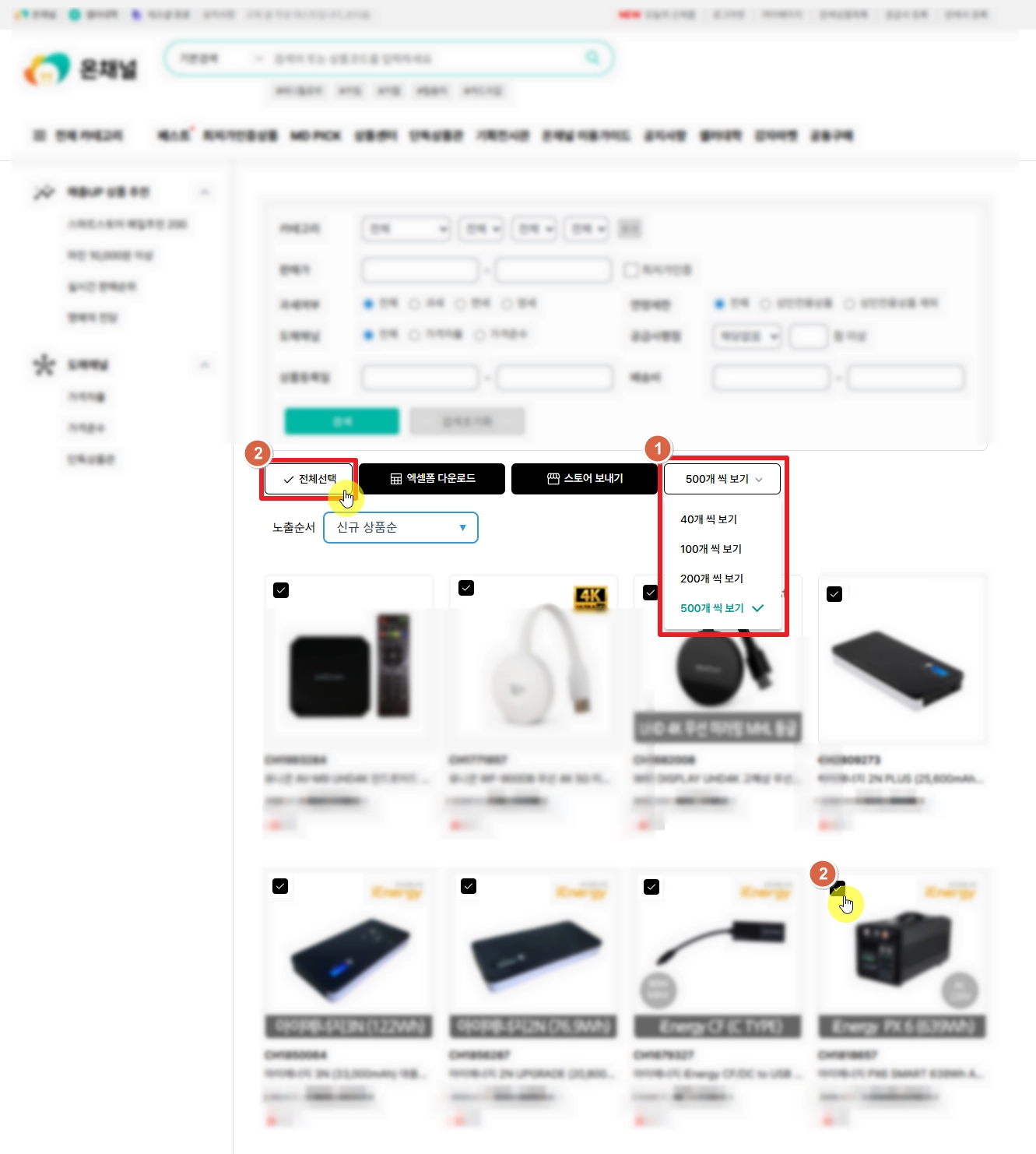 확인하고 싶은 상품 개수를 선택해 주시고, 엑셀로 다운로드 할 상품을 전체 선택 또는 개별로 선택해 주세요.