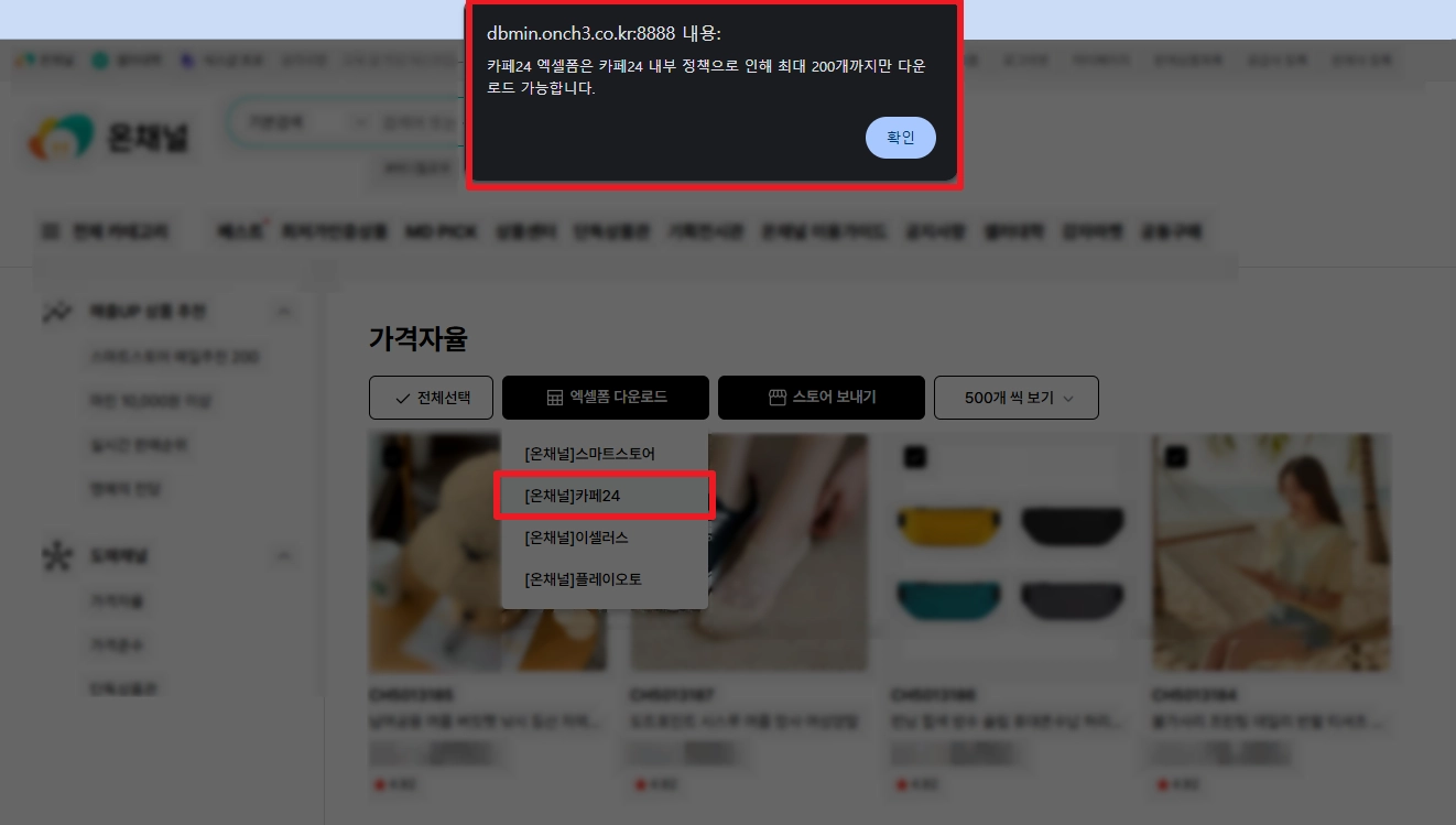 카페24는 내부 시스템 정책상 1회당 상품 등록 가능 수량은 최대 200개로 제한되어 있습니다. 따라서 온채널에서 상품을 500개를 선택하여도 카페24 엑셀 폼 다운로드가 불가하오니 200개 단위로만 다운로드해 주세요.