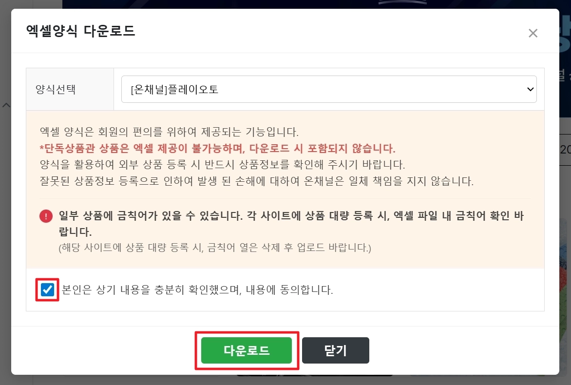 A. 2026.04.27부터 온채널 상품센터에서 엑셀 폼 다운로드 시 마지막 열에는 “금칙어”항목이 추가됩니다. 해당 열을 삭제하고 다시 등록 진행 부탁드립니다.(금칙어 관련 공지 바로 가기→)