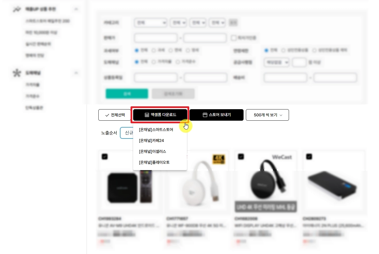 A. 온채널 상품센터에서 페이지 별로 다운로드가 가능하며, 한 페이지에 최대 500개까지 상품이 확인 및 한 번에 다운로드할 수 있습니다. 단, 카페24는 사이트 정책으로 인해 최대 200개까지만 가능합니다.