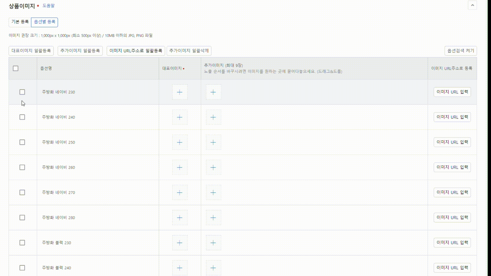 옵션이 많을 때, 각 옵션의 체크박스를 선택하여 'OO 이미지 일괄 등록' 기능으로 한 번에 등록할 수 있어요.