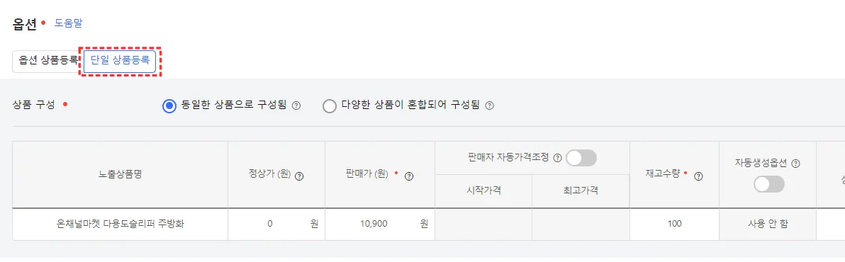 옵션이 없는 상품이라면 ‘단일 상품등록’을 선택합니다.