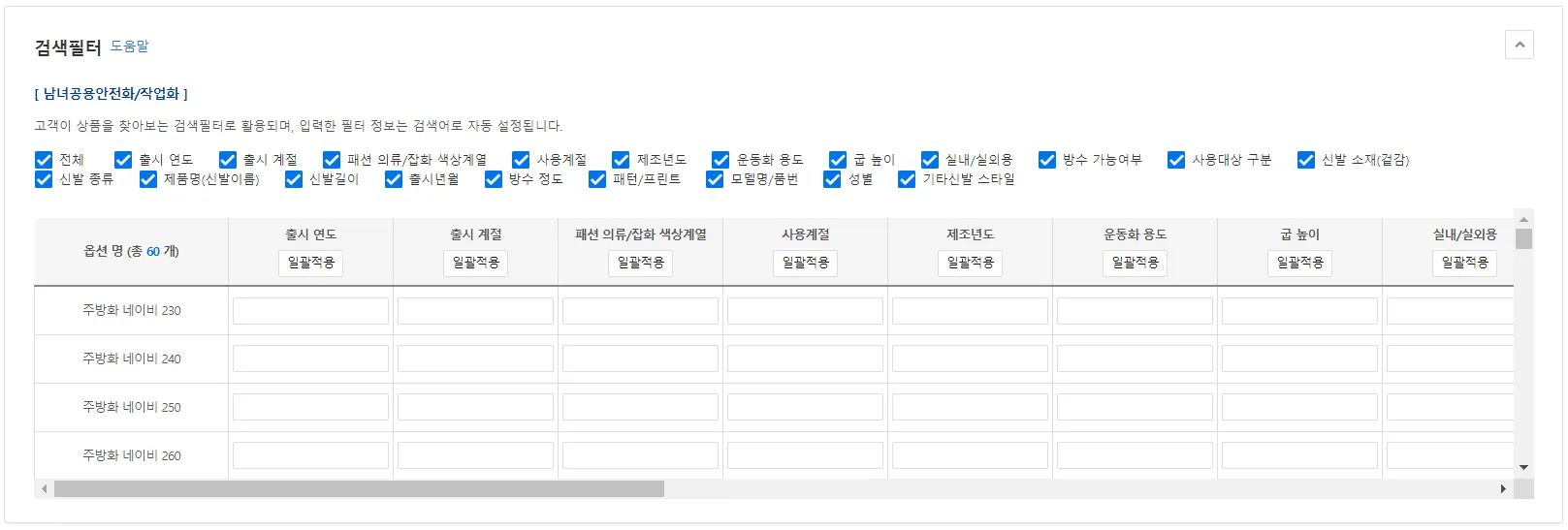 각 옵션의 검색필터는 빠짐없이 체크하세요. 모든 값이 노출될 수 있습니다.