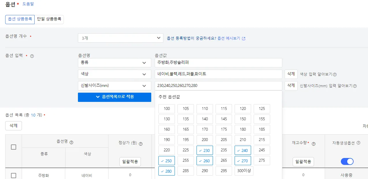 쿠팡 ‘옵션’ 항목을 다음과 같이 입력하고 [옵션목록으로 적용↓]을 누릅니다.