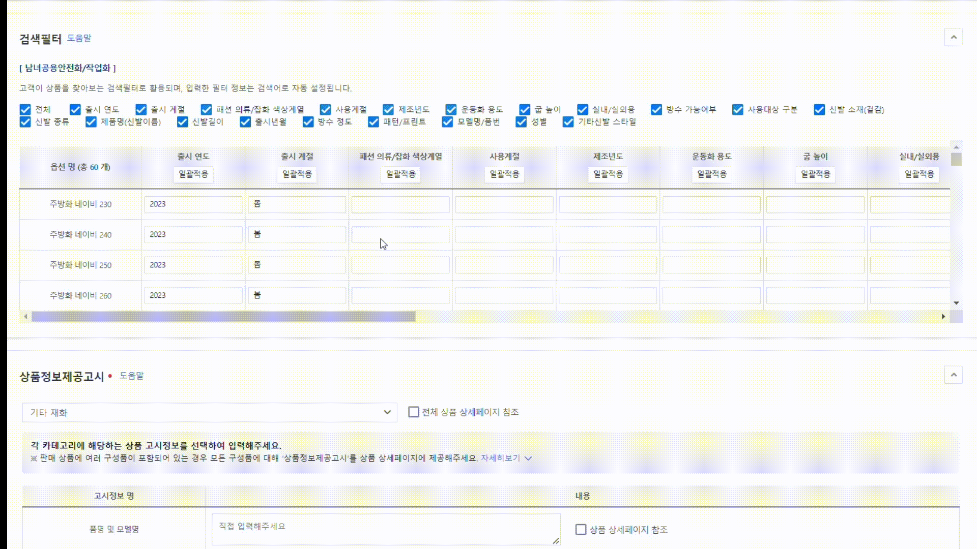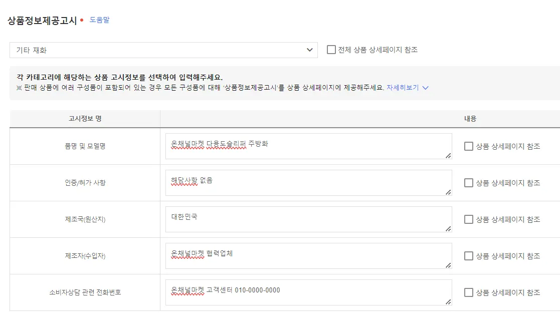 각 카테고리에 해당하는 상품 고시 정보를 선택하여 입력합니다.