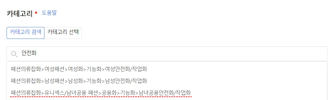‘카테고리 검색’에 검색하여 나온 결과에서 알맞은 카테고리를 선택했어요.