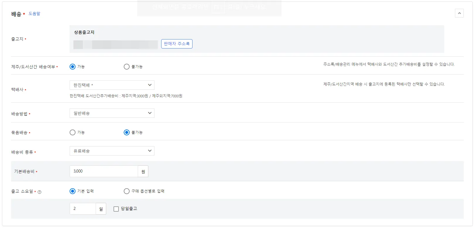 출고지: 판매자 본인의 출고지로 선택합니다.