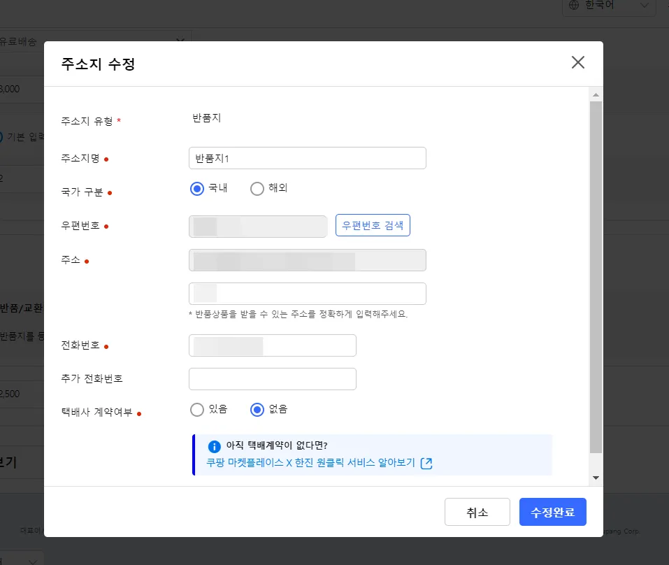 반품지 등록시 ‘택배사 계약여부’ “없음” 선택합니다.
