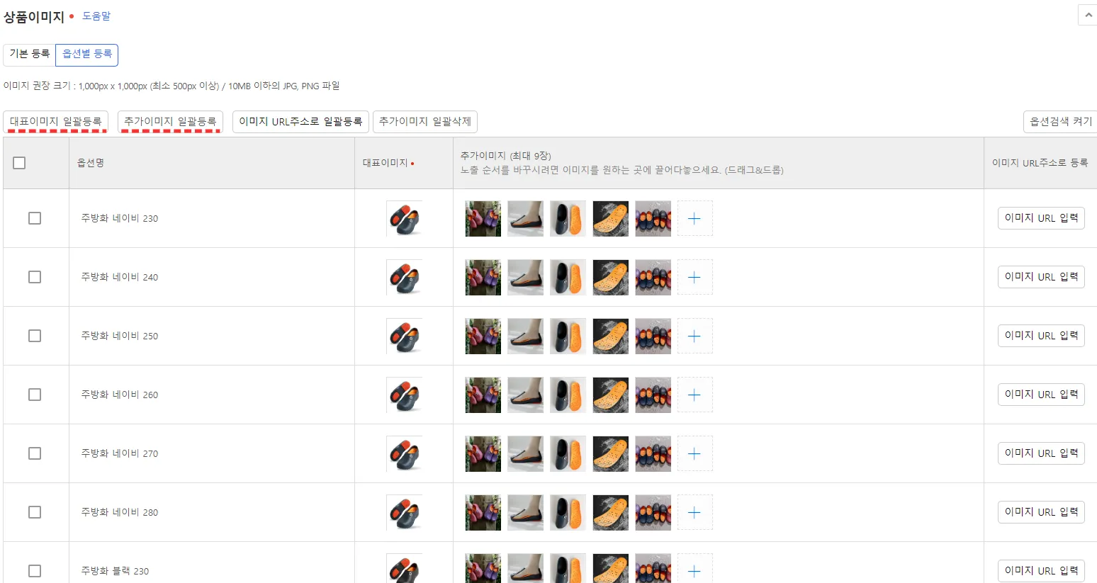 각 옵션별로 대표이미지를 각각 등록하되 추가이미지는 전체 일괄등록 해도 무관해요.