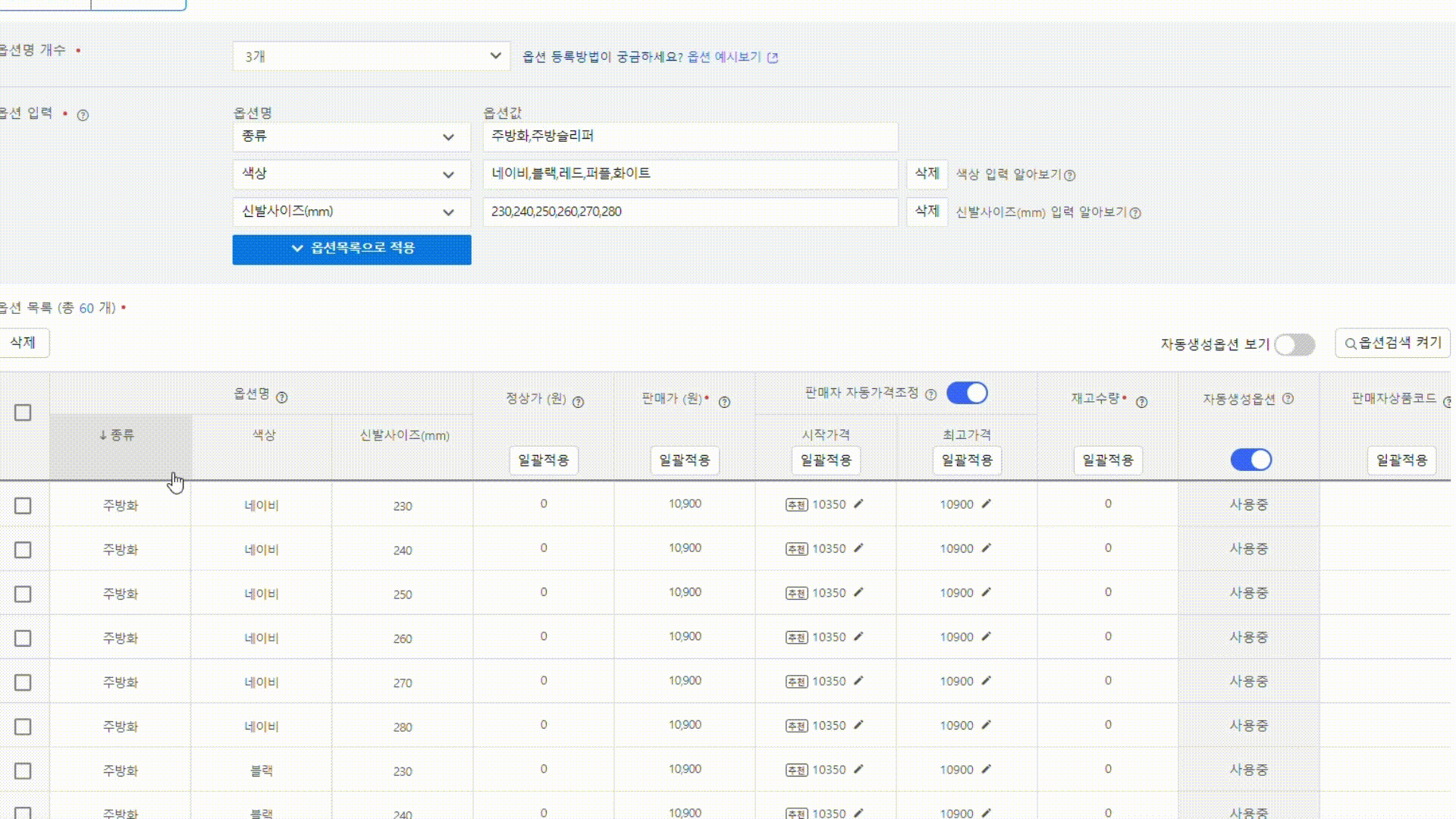 판매자 자동가격조정과 자동생성옵션은 비활성화할게요.