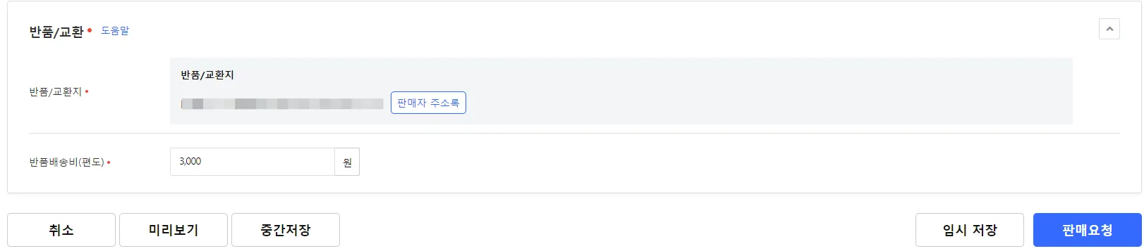 반품/교환지: 판매자 주소록을 선택하여 반품지를 선택합니다.