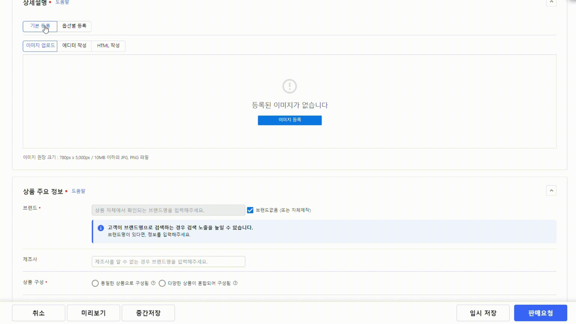 온채널에서 저장한 상세페이지 이미지를 추가한 후 [저장]을 누릅니다.