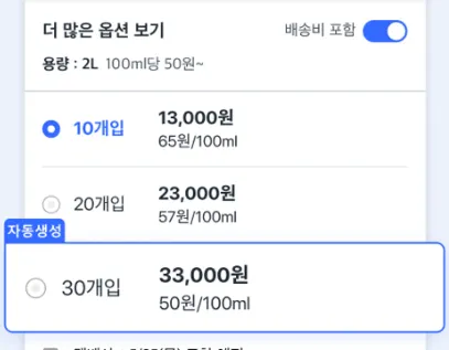 고객이 선호하는 수량이 발견되면 판매자가 설정한 가격과 배송비로 수량 옵션이 자동 생성돼요.