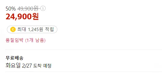 쿠팡에서는 재고수량이 9개 이하로 설정되면 상품페이지에 품절임박(개수 남음)으로 표시돼요!
