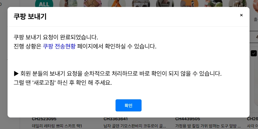 * 쿠팡 API 상품 전송은 해당 페이지에서만 상품 전송 상태를 확인할 수 있어요.