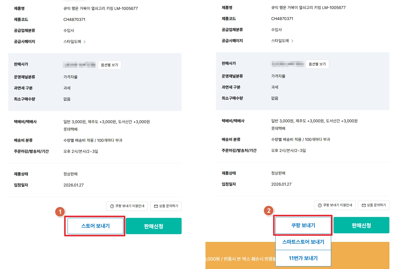 (2) 상품 페이지 내 [스토어 보내기 > 쿠팡 보내기] 버튼을 순서대로 눌러요.
