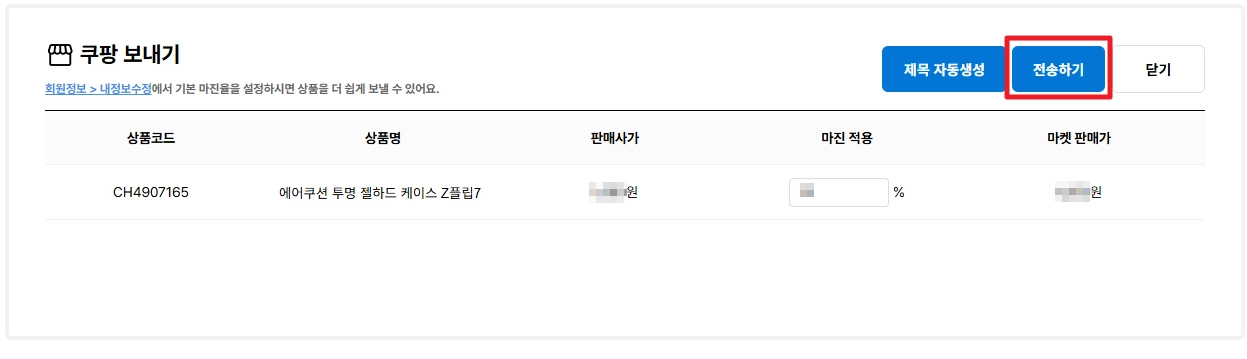 [내정보수정] 메뉴에서 아래로 내려 ‘상품 보내기 기본 마진’ 설정을 찾아, 원하는 기본 마진 %를 적어주세요.
